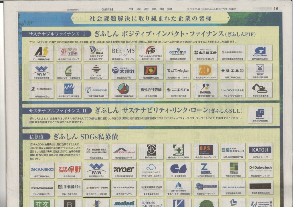 この度、㈱チューブ製作所はぎふしんSDGs私募債を発行しました。